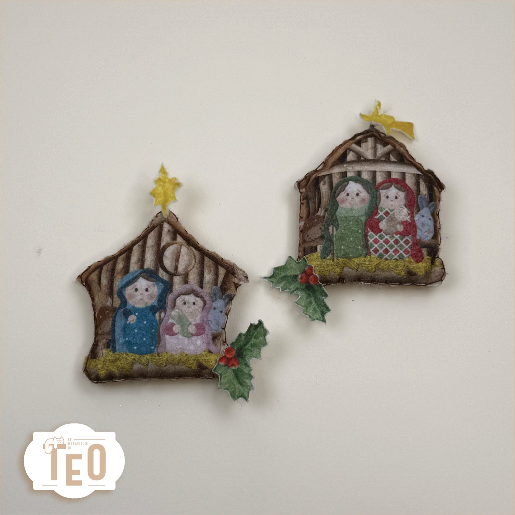 le piccole capanne , Con Maria, Giuseppe e Gesรน , sono accompagnate da dettegli come stelle, agrifogli e animali, per decorazioni calde e suggestive.