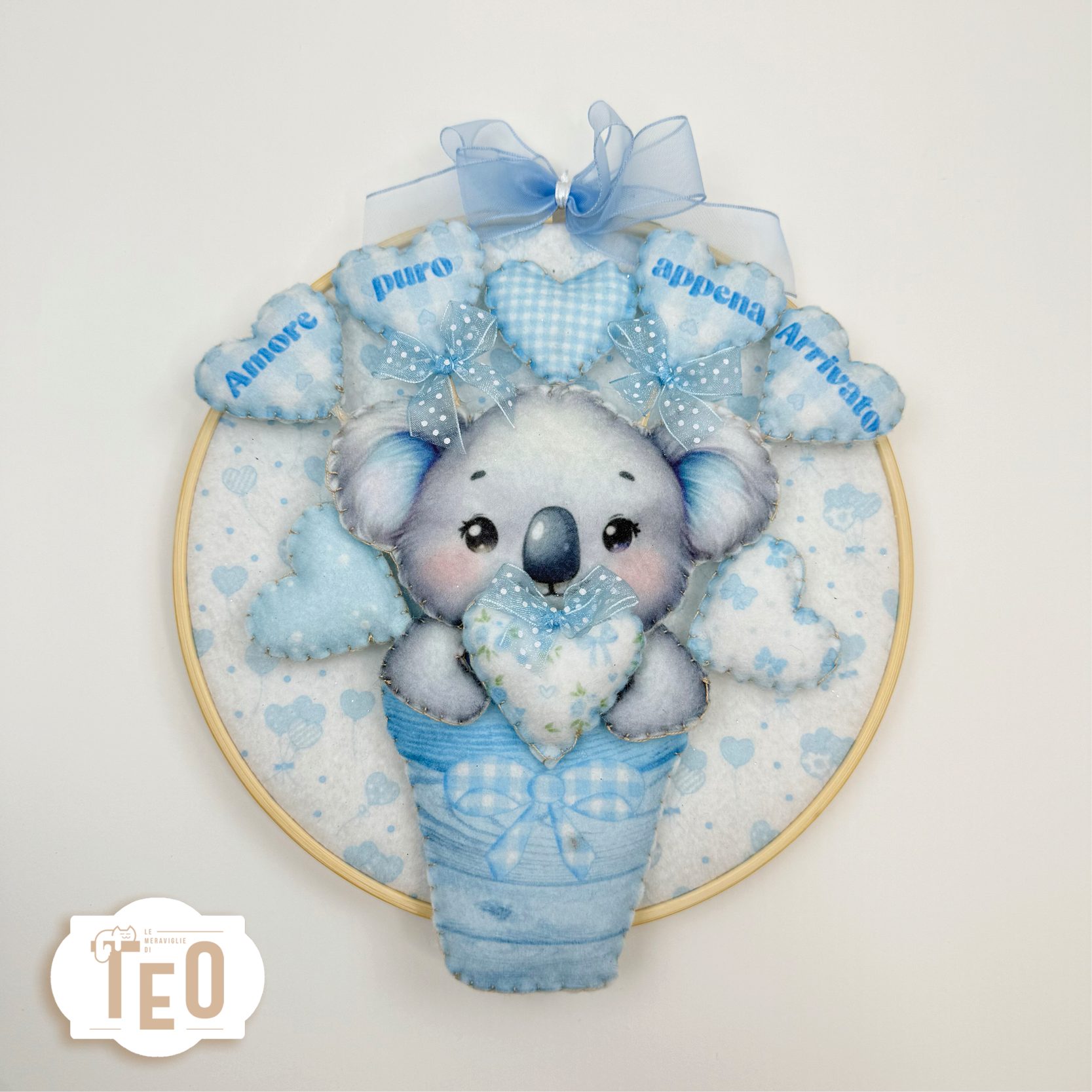 Un tenerissimo koala dai toni celesti, pronto a dare il benvenuto con dolcezza! Questo pannello in pannolenci misura 20×25 cm e contiene tutti gli elementi necessari per realizzare una decorazione perfetta per nascita, baby shower o cameretta. Facile da assemblare e ricco di dettagli tenerissimi.