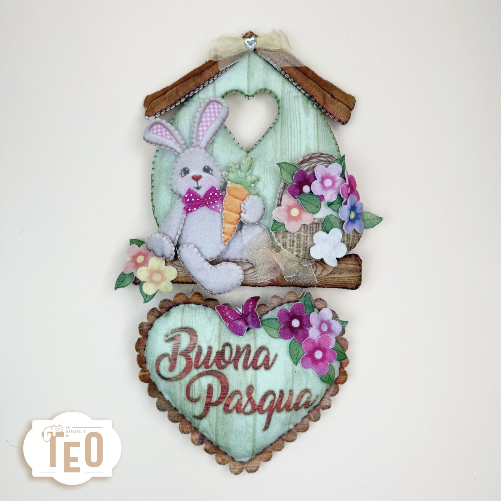 Un progetto pasquale tenerissimo: un coniglietto in stile country, la sua casetta in legno verde pastello e tattico colorati come fiori, carotine e farfalle.
