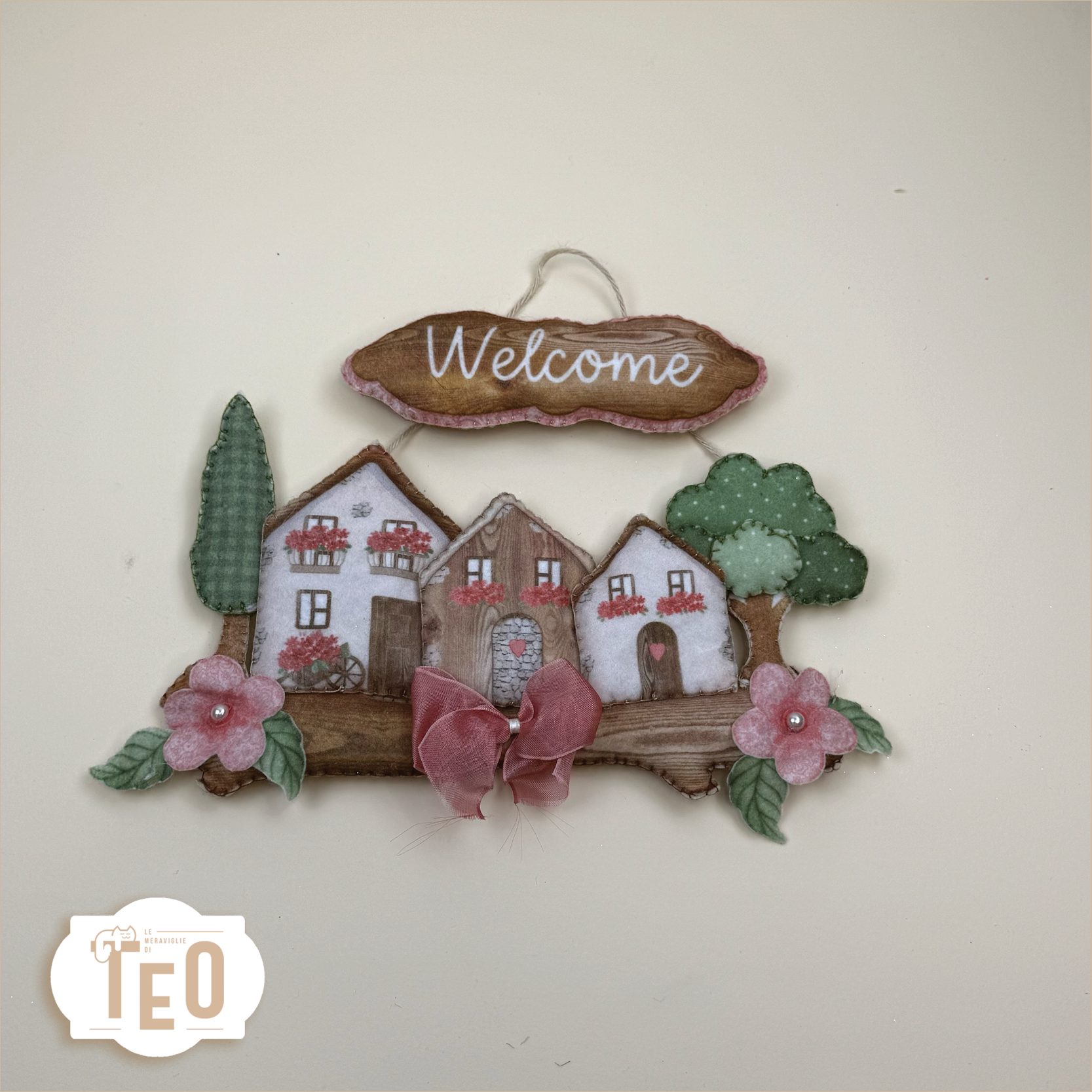 Casette fiorite, alberelli verdi, rami e dettagli botanici per dare il benvenuto alla primavera con stile. Questo pannello in pannolenci ti permette di creare un delizioso fuoriporta country dal tocco romantico, con la scritta Welcome in due versioni.