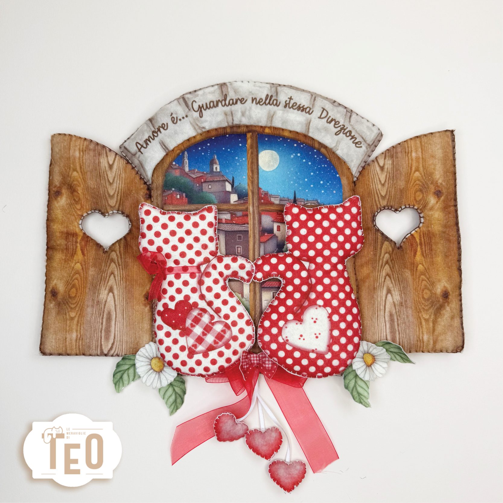 Un romantico scorcio dal sapore sognante: due gattini si affacciano su una finestra illuminata dalla luna, circondati da cuori e dettagli country.