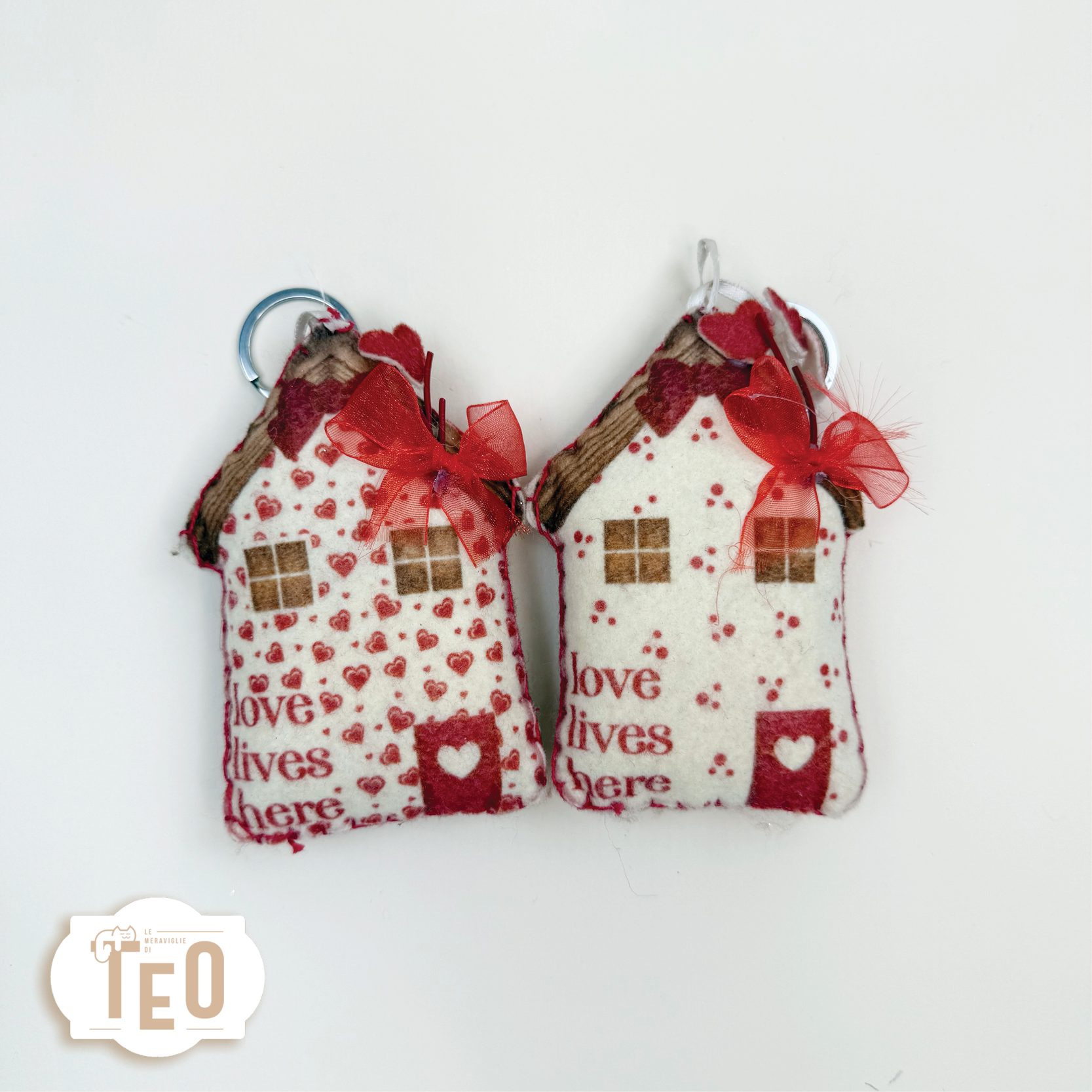 Un dolcissimo pannellino in pannolenci stampato con casette dal tetto in legno e cuori rossi, per realizzare portachiavi unici e romantici.