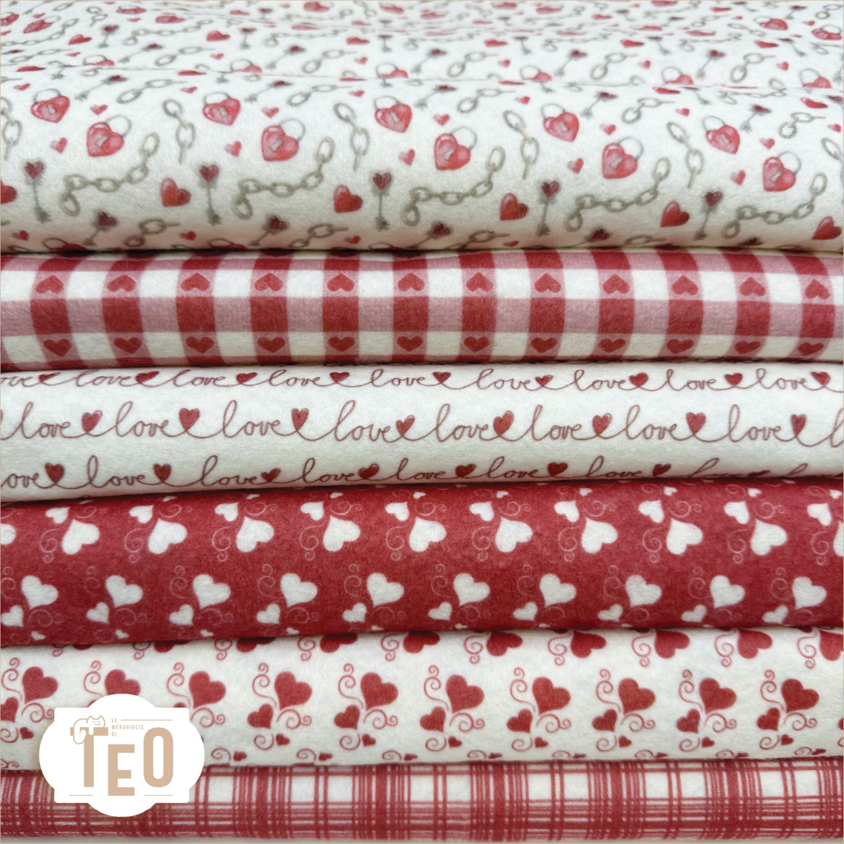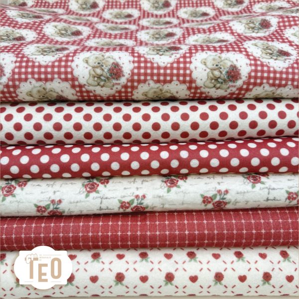 Le fantasie, armonizzate nei toni del rosso e del panna sono pensate per essere abbinate tra loro o utilizzate singolarmente in creazioni artigianali dolci ed eleganti.